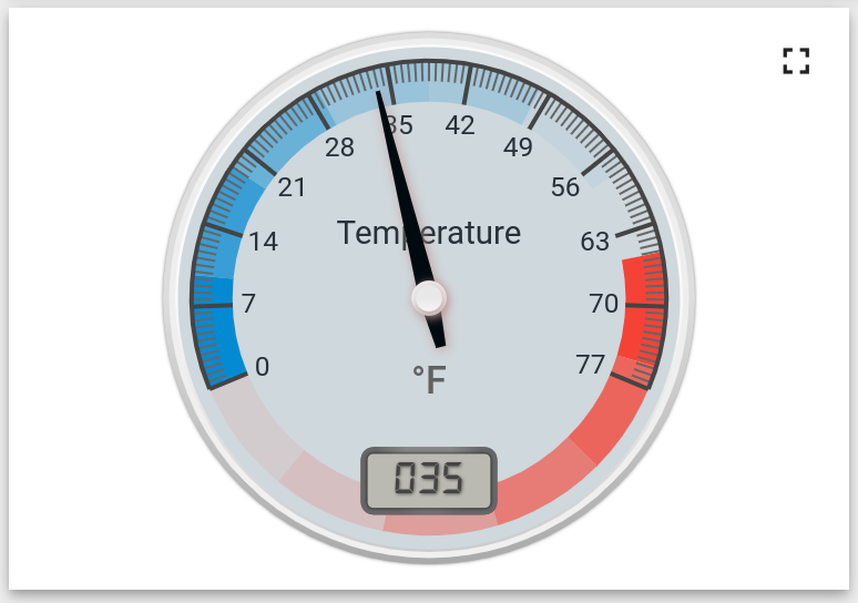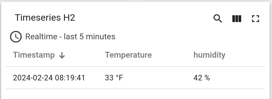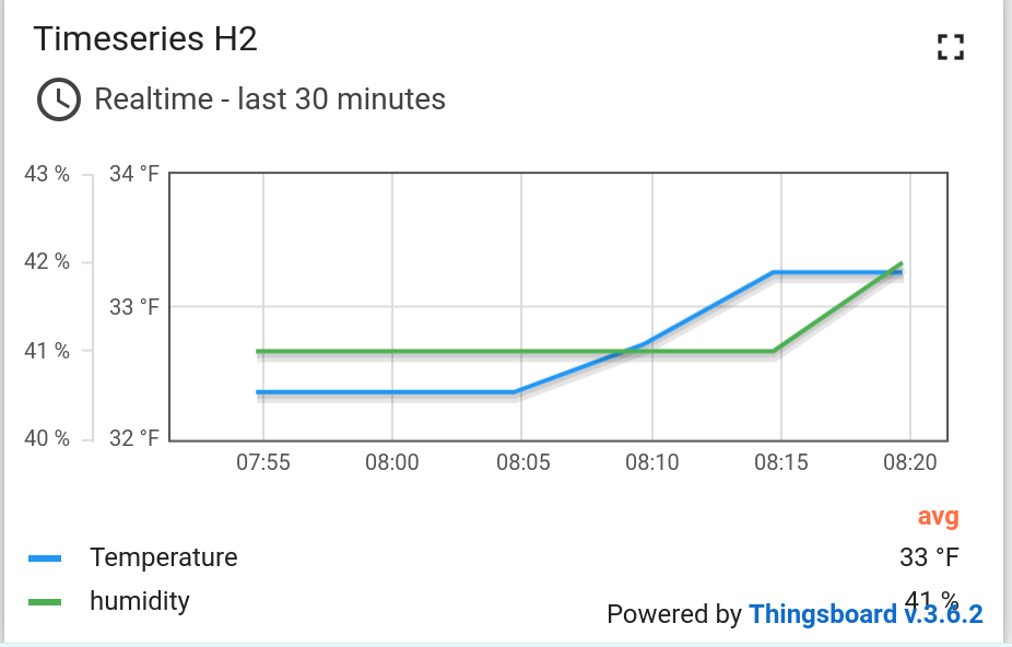 ThingsBoard is an open source service I have running on my developmental network. Incoming data (from an Arduino board with an attached sensor) is uploaded to a Postgres database and read by ThingsBoard. The service has a nice user interface that allows for ‘widgets’ to display the data. For example, my sensor outside the beehive, capturing external conditions, shows: