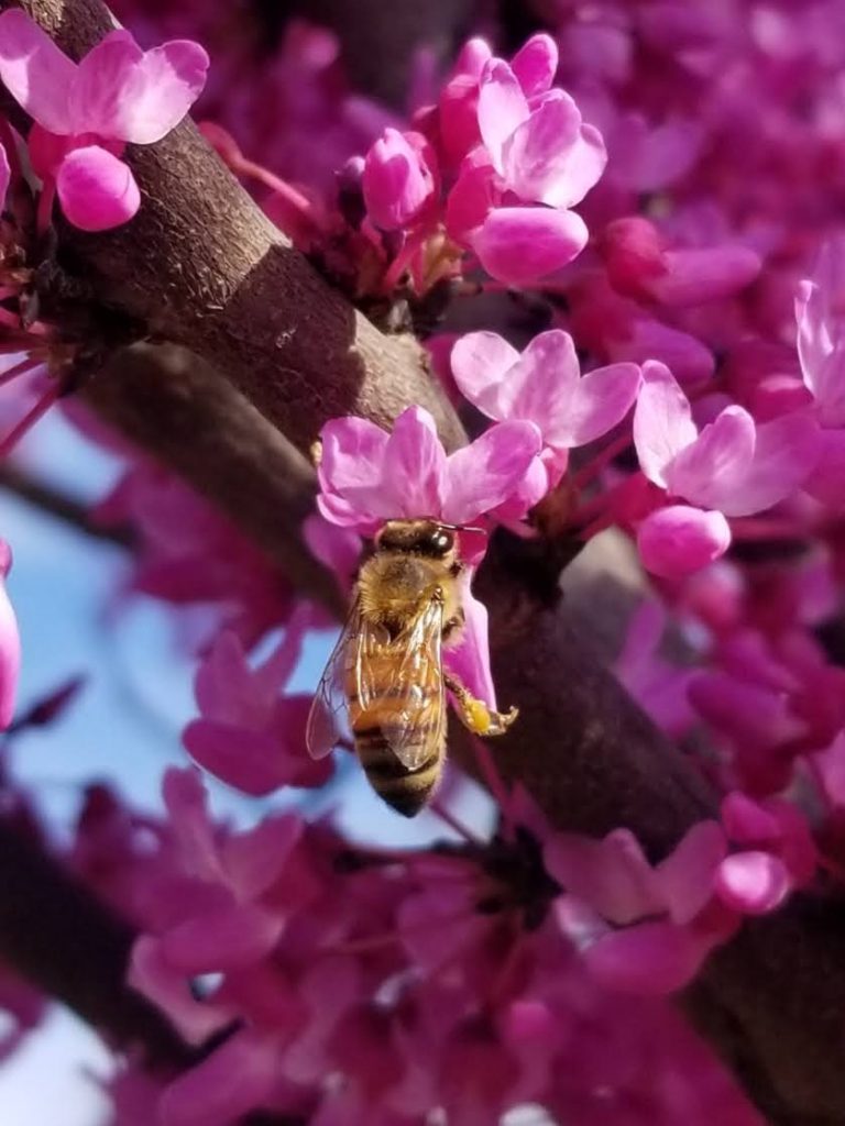 While we have not entered into our first nectar flow, I must be mindful of the colony’s need for adequate space. As the queen begins her brood buildup with egg laying and as the foragers are able to bring in pollen and nectar (however scarce), space can become confined. This confinement can trigger an early swarm. If your management style allows for or encourages swarms, then you may not be as concerned; otherwise, be vigilant about providing sufficient space and resources for the growing colony. When I see drone comb, I am keenly aware that swarm season is quickly approaching. If weather and resources allow, I will consider early splits.